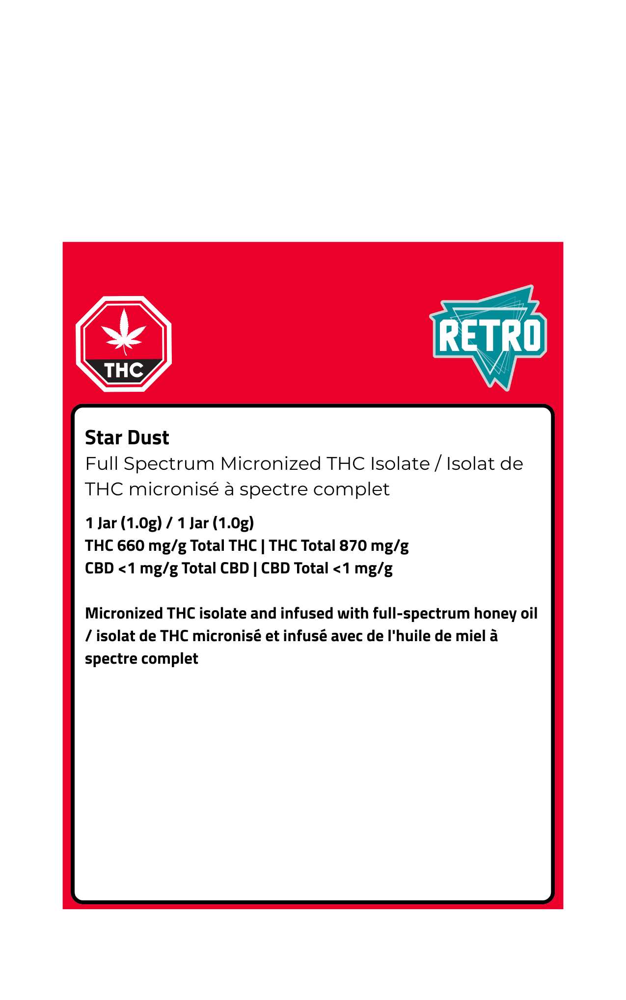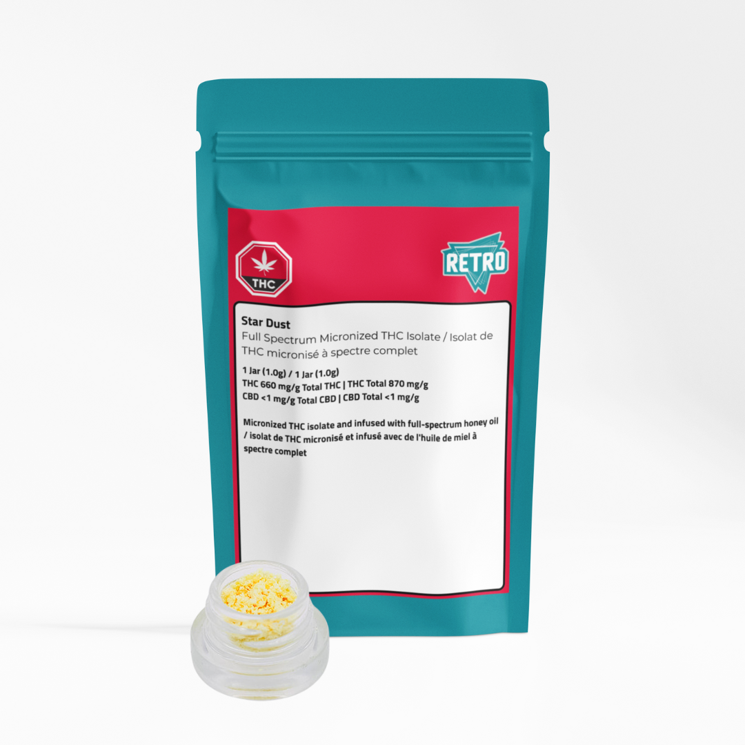 Light, powerful, and ready to elevate—Star Dust is a high-potency full-spectrum concentrate designed for those who want to take their experience even further. Made with micronized THC isolate and infused with full-spectrum honey oil, this fine-grain concentrate is perfect for adding an extra boost to joints, bowls, or dabs. Expect a smooth, clean burn with bold notes of citrus, spice, and earth, followed by an intensely potent, long-lasting high. Whether you’re enhancing your pre-roll, supercharging a bowl, or dabbing for a next-level hit, Star Dust is crafted for those who like to go big.